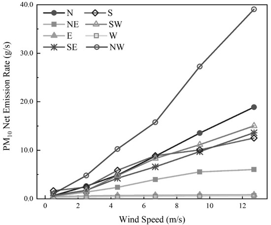 Under the same external wind direction, there was a positive correlation between external wind speed and PM10 discharge rate (Figure 8). Meridional wind-generated far more PM10 discharge than zonal wind under the same external wind speed. The yard discharged most PM10 under northwest wind (NW). From Figure 6h, when the external wind blows from the northwest, the inflow through gate 5 blew directly towards the sinter loading area. The local air velocity at the loading area was significantly greater than average level, leading to the peak value of 39.1 g/s in PM10 discharge rate at wind speed 12.7 m/s. This level was eight times higher than wind speed in 2.5 m/s with the same NW wind direction. In contrast, the entire enclosed yard was under the static condition when the wind blows zonally. Air velocity at loading area was at the same order of magnitude as deposition velocity at this time, so the PM10 discharge rate became small, e.g., under east and west wind direction, PM10 discharge rate were 47 and 62 times lower than NW wind with the same wind speed in 12.7 m/s, respectively. Therefore, PM10 discharge rate from the enclosed area to open-air is significantly influenced by wind velocity and direction.