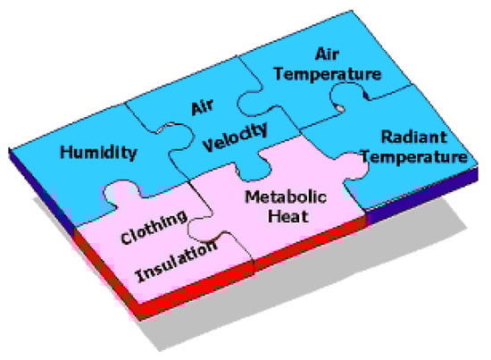 Four environmental (blue) and two non-environmental or personal (pink) factors affecting human thermal comfort (Image Source []). The indices discussed in this study account for the three environmental factors: “Humidity”, “Air Velocity”, and “Air Temperature”. For a detailed discussion on the six factors and their interactions, readers are referred to Epstein and Moran [].