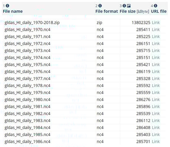 All indices in HDI_0p25_1970_2018 (Table 1) are made publicly available in the commonly used scientific Network Common Data Form 4 (NetCDF-4) file format (“.nc4”) on PANGAEA https://doi.org/10.1594/PANGAEA.904282 [] (Figure 2). The secondary variables (Equations (18)–(21) below) based on GLDAS are available from the author upon request. Both the HDIs and the secondary variables are on daily timescales spanning years 1970–2018. Data for each HDI are bundled as individual annual .nc4 files, as well as a single .nc4 file containing all 49 years.