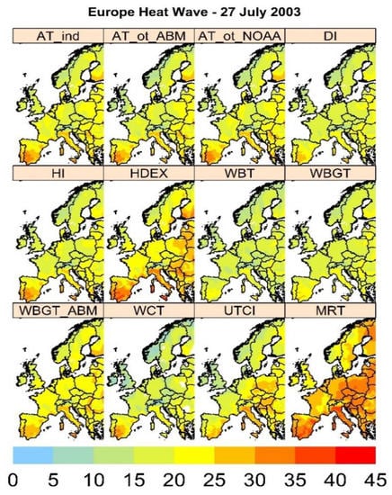 Composite human bioclimatic indices or human discomfort indices (HDIs), accounting for environmental factors, along with their strengths and limitations have been well documented in the literature (see [,,,,,,] as examples for further reading). Importantly, experts also acknowledge that no single HDI is universally applicable under a broad range of human metabolic and work exposure environments [,,,] (e.g., indoor and outdoor labor activities), climatic zones [,] (such as arid, tropical, temperate regions), and direct/indirect exposures to weather elements [,] (e.g., sunlight, wind etc.). For instance, as highlighted by [], more than 30 heat stress indices have been developed dating back to early 20th century. These differ not only in the input variables they use, but also in the way their effects are parameterized [,]. Yet, despite the recognized importance of these indicators for human health, comfort, and performance, there is a dearth of open access high spatiotemporal resolution datasets, encompassing a broad range of HDIs. This is particularly true for global datasets covering a long historical time series, derived from the same underlying observation-based data source, thus offering the health impacts community with a consistent homogenous spatiotemporal record of HDIs. An exception is “ERA5-HEAT” [] which includes two HDIs (Universal Thermal Climate Index—UTCI and Mean Radiant Temperature—MRT) at 0.25° global gridded resolution, spanning years 1979–2019, made recently available through the Copernicus Climate Data Store (CDS) [] at hourly timescales.