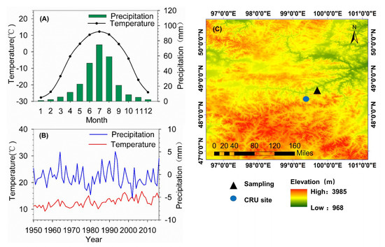 The study area was located in the semiarid forest-steppe ecotone of western Mongolia, at an elevation of 1757 m above sea level. (Figure 1). In this area, due to the effects of the arid climate and topography, forests are restricted in distribution to the relatively cool and wet north-facing slopes, whereas the warm and dry south–facing slopes are covered with mountain steppe [31,32]. In the forested areas, Pinus sylvestris, Populus davidiana, Betula platyphylla, and Larix sibirica often form mixed stands. Our sampling site (99.35° E, 48.47° N) was close to the southern edge of the boreal forest, where Larix sibirica is the dominant tree species. Climate data (Climate Research Unit, CRU TS4.02) for the period of 1965–2016 for the grid (99.5° E, 48.5° N) in close proximity to our sampling site, indicate that annual precipitation in the area was approximately 265 mm, with 69% falling during June to August. The annual mean temperature was −0.41 °C, with the warmest and coldest months being July (12.2 °C) and January (−27.7 °C), respectively (Figure 1). Previous studies indicate that tree growth in the semiarid area is climate-sensitive [33]. At the study site, the population of Siberian larch was composed of widely dispersed trees, and the forest canopy cover was sparse, indicating a physiognomy consistent with xeric vegetation and suggesting the importance of drought as a factor influencing community structure. In this region, we randomly selected trees for sampling. Two cores, one parallel to the slope and another parallel to the contour, were taken from each randomly selected tree. In total, 74 cores were collected during the summer of 2017.