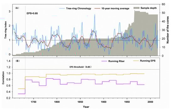 (A) The regional tree-ring standard chronologies and sample depth. (B) The running Rbar (30-year window lagged 15 years) and the running expressed population signal (EPS). The reliable portion of the chronology has running EPS value >0.85.