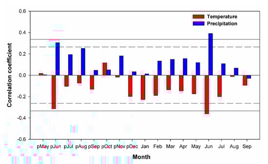 Correlations of the standard master chronology with monthly mean temperature (red bars), monthly total precipitation (blue bars) during the period of 1965–2016. The solid line and dashed line indicate p < 0.05 and p < 0.01, respectively.