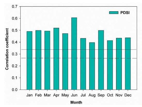 Correlations of the standard master chronology with Palmer Drought Severity Index (PDSI) data for different months of the current growth year during the period of 1965–2016. The solid line and dashed line indicate p < 0.05 and p < 0.01, respectively.