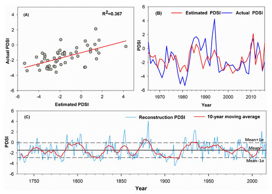 (A) Correlation of actual and estimated June PDSI during the period of 1965–2016; (B) Comparison of actual and estimated June PDSI 1965–2016. (C) Tree-ring reconstructed June PDSI plotted annually (blue line) 1731–2016, along with a smoothed 10-year moving average (red line).