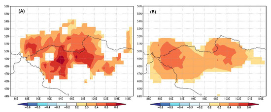 Spatial correlations between the PDSI reconstruction and (A) June mean precipitation and (B) actual PDSI from the Climate Research Unit, CRU TS4.02 data (1965–2016) (p < 0.01).