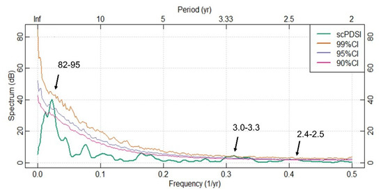 Drought in arid and semi–arid areas can be influenced by local, regional, or global scale factors [56,57,58,59]. Our reconstructed PDSI series have high and low frequency periods (85–92, 3–3.3, and 2.4–2.5 years), indicating that drought variability in the Hangai mountain range of Mongolia has connections to different circulation systems and climate models. Specifically, the significant high-frequency 2.4–2.5 years (p < 0.05) and 3–3.3 years (p < 0.01) cycles of reconstructed PDSI have been widely reported in previous studies and may be linked to the tropospheric biennial oscillation [60] in the regions of southern of Kazakhstan [23] and Tibetan Plateau [61]. The high frequency cycles (3–3.3 years) also fall within the range of the ENSO (El Niño-Southern Oscillation) periods of 2–8 years over the entire reconstruction [22]. A significant negative correlation (r = –0.316, p < 0.01) was found between our reconstructions (10-year moving average) and the multivariate ENSO index (10-year moving average) in whole reconstructed period.