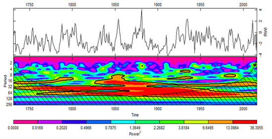 Wavelet plots for reconstructed June PDSI. Areas surrounded by thick black contours (95% significant level, using red noise background spectrum) are regions of significant power at corresponding timescales.