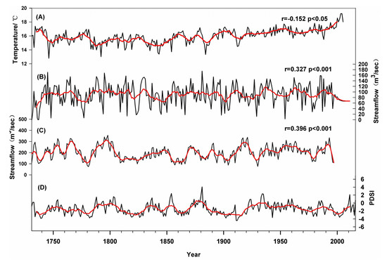 - Liu, Y.; Zhang, X.; Song, H.; Cai, Q.; Li, Q.; Zhao, B.; Liu, H.; Mei, R. Tree-ring-width-based PDSI reconstruction for central Inner Mongolia, China over the past 333 years. Clim. Dyn. 2016, 48, 867–879. [Google Scholar] [CrossRef]