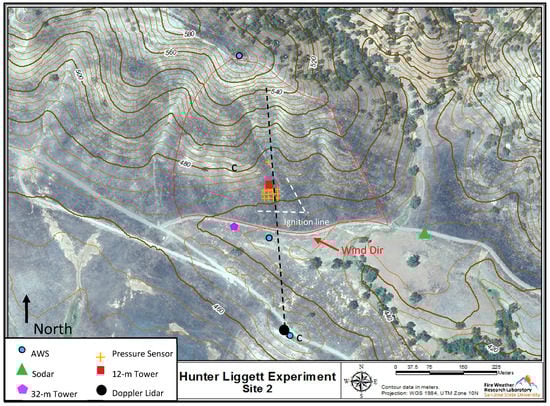 Small-scale field experiments, defined generically as a burn unit with a horizontal scale of ~1 km2 or less, have been critical in observing key turbulent structures associated with the fire front and fire spread. This is because a large array of instrumentation can be deployed strategically within the fuels to allow the fire front to pass through the instrumentation. A varying level of complexity can be achieved by using sites with various fuel types [,,,], more complex terrain [], and high wind conditions []. These experiments have led to improved understanding of fire–atmosphere interactions associated with fire spread. For example, in a small burn on a slope with a cross-wind, cross-slope momentum transport that reached the surface layer was caused by along-wind vorticity within the plume []. However, there still remain poorly observed and understood plume processes including the accelerating updraft and its dynamics, the surface inflow winds including the rear inflow into the fire front, and turbulence generated at the head of the fire [,].