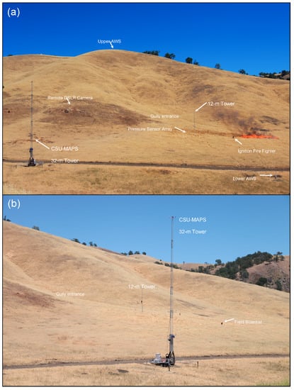 The experimental site was characterized as an oak savanna woodland dominated by tall grass with sparse oak trees. The experimental plot was located at the base of a steep hill on a flat area with a slope of ~8° (Figure 2a,b). The hill was incised by a shallow ravine or gully where the lower and upper sections of the gully had slope angles of 22° and 24°, respectively. The anticipated fire spread direction was up the gully, but the ambient wind direction (cross-slope) prevented the fire front from spreading up the slope until extra ignition flares were used in the gully.