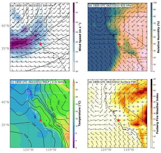 Global Forecast System reanalysis of (a) 500 hPa wind speed and height contours, (b) 925 hPa relative humidity, (c) mean sea-level pressure (MSLP) and 2-m air temperature, (d) surface Fosberg Fire Weather Index. Experiment site is indicated by the red star.
