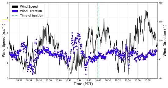 Time series of 7-m AGL wind speed and wind direction on 22 June 2012 observed using the CSU-MAPS tower. Ignition time is indicated by the vertical green dashed line.