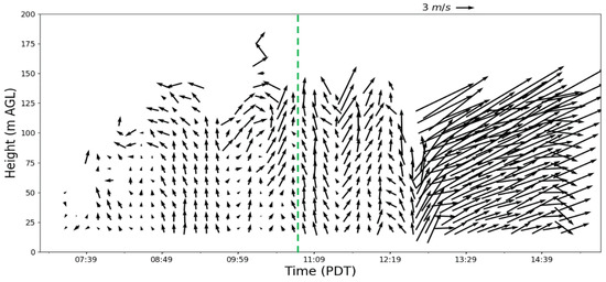 Time–height plot of vertical profile of winds measured from Doppler sodar located near the burn plot boundary (Figure 1). The time of ignition is indicated by the dashed green line.