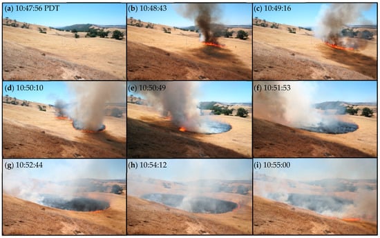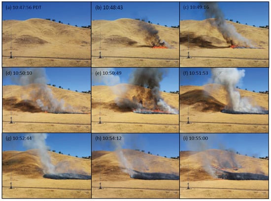(a–i) Photographic time series fire front positions and plume structures. Times indicted are HH:MM:SS (PDT). Please refer to Figure 1 for plot orientation; camera was located at lidar location.