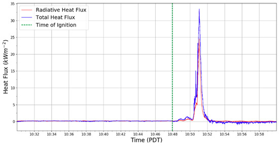 The rate and direction of fire spread were estimated from the time series of photographs in Figure 7 and Figure 8. The rate of spread was estimated to be 0.5 m s−1 through the base of the tower. Flame height and length were estimated from photographs to be 4 m and 7 m, respectively. The surface wind speed at 7 m AGL was approximately 3 m s−1 during the ignition process and the wind direction was southeasterly between 100 and 110°. This wind direction was parallel to the fire ignition line (Figure 1). The fire intensity was determined from radiative and total heat flux radiometers measured during the FFP. The measured total heat flux peaked during the FFP at ~33.5 kW m−2 and the radiative heat flux measured was 24.5 kW m−2. These measurements were made using the heat flux radiometers mounted at 3 m AGL described above and represent the vertical radiative heat flux associated with the fire front as it passed under the tower. The photographic time series in Figure 8 shows the evolution of the fire front shape as the fire progressed underneath the 12-m tower. Initially, the fire spread slowly as a flank fire towards the tower, but soon after, the fire began to spread perpendicular to the tower (Figure 8c) as a head fire. In order to counter this, an additional ignition line was started just before 10:50:10 PDT (Figure 8d) near the heel of the fire forming the eastern flank. This caused the fire front to wrap around the tower (Figure 8d–e) and spread past the tower and towards the gully entrance at 10:51:53 PDT (Figure 8f). At this time, the plume was upright and consisted of a single core (Figure 7f and Figure 8e) before dispersing in response to decreased fire intensity (Figure 7h and Figure 8f).