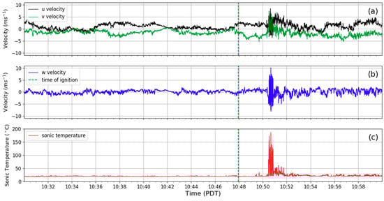 Time series of 12-m u and v wind velocities (a), w, vertical velocity (b), and sonic temperature, Ts (c). The vertical dashed line indicates the time of ignition.