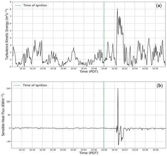 Time series of 10-s averaged (a) turbulence kinetic energy and (b) sensible heat flux. The vertical dashed line indicates the time of ignition.