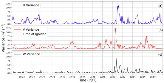 Time series of 10-s averaged velocity variances of (a) u, (b) v, and (c) w. The vertical dashed line indicates the time of ignition.