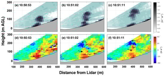 Plume evolution was observed using the scanning Doppler lidar during the time of the FFP. Figure 13 shows a sequence of RHI scans made during the plume rise, where the plume structure is indicated in the smoke backscatter intensity (Figure 13a–c) and the radial velocities in panels (d–f). From this sequence, the plume rose by approximately 75 m in 9 s from 10:50:53 to 10:51:02 PDT, which equates to a plume rise rate of 8.3 m s−1, which is similar in magnitude to the vertical velocity measured at 12 m AGL on the tower. Additionally, at 10:50:53 PDT, indraft velocities of the near-surface plume increased to ~5 m s−1, as indicated by the arrow in Figure 13d. This period is just after the FFP occurred at the tower and is also corroborated in Figure 8e. At 10:51:02 and 10:51:11 PDT, the radial velocities in the upper region of the plume indicate the presence of horizontal-axis vorticity and overturning of the plume top, as shown by the arrows overlaid on the panels (Figure 13e,f). This overturning suggests strong entrainment and demonstrates the mixing of warm plume air downward that was also observed by the negative sensible fluxes in Figure 11b. Additionally, this is illustrated in Figure 13b, where the smoke backscatter intensity decreased in the middle of the plume. This may be explained by entrainment that caused the plume core to separate from the fire front. This entrainment and plume core separation could have been caused by the increased near-surface indrafts or the plume overturning, or a combination of both. This process may likely help to drive fire spread under weak ambient winds, but this is only speculation.