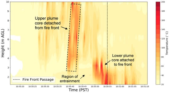 Time–height plot of 5-Hz thermocouple temperatures on the interior 12-m tower showing plume core thermal structures and separation caused by strong entrainment that develops two coherent and isolated plume cores. The plume impacted the tower from approximately 10:50:27 to 10:51:10 PDT. This is also shown in the photographic time series of Figure 8. Vertical dashed line indicates FFP.