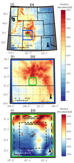 Plan view maps of surface elevation (m, above mean sea level) in Advanced Regional Prediction System (ARPS) domains (a) D1, (b) D2, and (c) D3. In (c), the FLEXPART-WRF domain and particle release zone described in Section 2.3 are indicated with long and short dash black squares, respectively. In (a,c), red symbols indicate observation sites: circle Grand Junction, Colorado (KGJT) rawinsonde, triangle (Saul’s Creek portable rawinsonde and light detection and ranging (LiDAR) ceilometer, co-located), square (Remote Automated Weather Stations (RAWS); letters correspond to panels in Figure 5). The black polygons in the center of (c) depict the two burn units active on 10 September 2018, units 10 and 11.