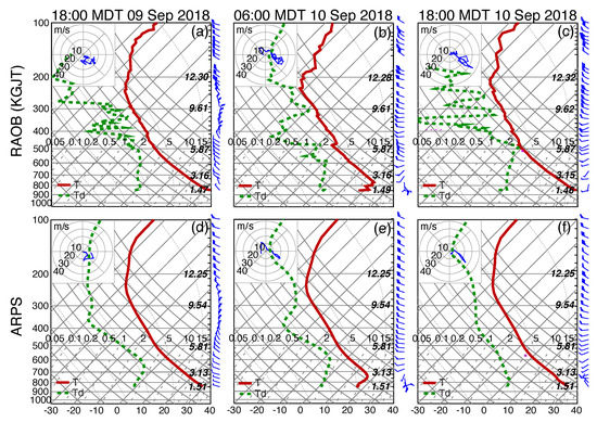 First, vertical soundings of temperature and dewpoint are presented on a skew T–log P diagram, along with hodographs and wind vectors, as observed at Grand Junction, Colorado (KGJT, see red circle in Figure 1a), and as simulated by ARPS in domain D1, at 18:00 MDT 9 September, 06:00 MDT 10 September, and 18:00 MDT 10 September (Figure 2). As shown in Figure 2, the observed and model soundings generally agree, with the model simulating a deep mixed layer at the 18:00 MDT observation times (cf. Figure 2a–c,f) and a stably-stratified nocturnal boundary layer beneath a residual layer at the 06:00 MDT 10 September observation time (Figure 2b,e). Furthermore, the model captures the west to northwest winds in the mixed layer at the 18:00 MDT observation times, and east to southeast winds in the nocturnal boundary layer at the 06:00 MDT 10 September observation time. With respect to simulation deficiencies, a consistent cold bias at the surface is seen at the 18:00 MDT observation times, and the model fails to reproduce a saturated layer atop the mixed layer (with rapid changes in dewpoint in the overlying free atmosphere, evidence of cumulus cloud development atop the mixed layer) at 18:00 MDT 10 September.