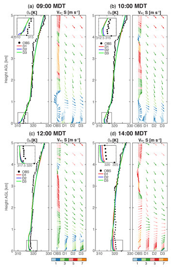 Vertical profile comparison of portable rawinsonde sounding and model sounding at nearest grid point to sounding launch site (red triangle in Figure 1c), at (a) 09:00, (b) 10:00, (c) 12:00, and (d) 14:00 MDT 10 September 2018, for all three model domains. In each panel, left sub-panel depicts virtual potential temperature, and right sub-panel depicts wind vectors (color scale for wind speed included at bottom of figure). In order to focus on the planetary boundary layer (PBL), only the lowest 5 km of the atmosphere is displayed. Inset panels in upper-left corner of each virtual potential temperature panel depict the lowest 500 m of the model atmosphere.
