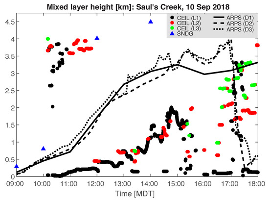 Meteorological instrumentation was deployed during the Saul’s Creek fire event with the specific goal of measuring the variables required for calculation of VI. A portable rawinsonde system was deployed immediately northeast of burn units 10 and 11 (triangle in Figure 1c) to collect profiles of potential temperature, mixing ratio, and wind speed at multiple times during the fire event day (09:00, 10:00, 12:00, and 14:00 MDT on 10 September 2018). A Vaisala CL31 ceilometer (Vaisala Corporation, Helsinki, Finland) was deployed coincident with the rawinsonde launch site to estimate mixing heights approximately every 15 s. The ceilometer is a light detection and ranging (LiDAR) instrument that measures backscatter, with three mixed layer height estimates derived from backscatter returns [17,18,19]. In the post-processing of the ceilometer backscatter data, an algorithm is used that searches for the three strongest negative backscatter gradients (i.e., backscatter sharply decreasing with increasing height). These gradients separate layers with relatively uniform aerosol density. Under clear-sky conditions, the tops of these aerosol layers can be interpreted as mixed layer height estimates. In addition to the instrumentation deployed during the fire event for VI calculation, Remote Automated Weather Stations (RAWS) surface observations (squares in Figure 1c) and Grand Junction, Colorado rawinsonde soundings (circle in Figure 1a) provide additional weather data with which to characterize the background meteorology. All meteorological observations are utilized in this study to evaluate the ability of the ARPS simulations to characterize the background weather conditions during the event (Section 3.1).