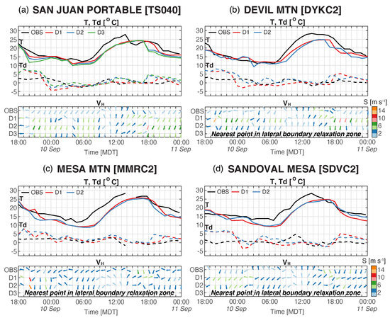 Time series of observed and simulated temperature (T), dewpoint (Td), and horizontal wind vectors (V; color scale for wind speed (S) included to right of figure), at four RAWS sites: (a) San Juan Portable (TS040), (b) Devil Mtn (DYKC2), (c) Mesa Mtn (MMRC2), and (d) Sandoval Mesa (SDVC2). Note that domain D3 is omitted from panels (b–d) because nearest grid points to RAWS sites are in lateral boundary relaxation zone. Temperature and dewpoint are measured at 2 m above ground level (AGL) at all four RAWS stations, and wind speed is measured at either 2 m AGL (TS040) or 6.1 m AGL (DYKC2, MMRC2, and SDVC2); all simulated variables are valid at the lowest grid level (D1: 25 m; D2: 12.5 m; D3: 5 m AGL). See Figure 1c for location of RAWS sites.