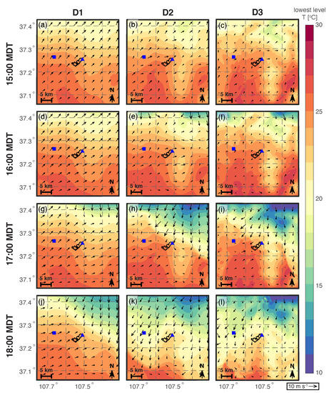 From 16:00 MDT to 18:00 MDT, the passage of the thunderstorm outflow is depicted by the emergence of north to northeast winds and temperatures 5–10 °C lower than depicted in the pre-outflow environment at 15:00 EDT (cf. Figure 6a–l). As depicted in the simulated temperature time series at the San Juan Portable RAWS site (Figure 3a; location depicted with blue square in Figure 6), temperatures drop approximately 5 °C within one hour and winds shift from southwest to northeast and, in domains D2 and D3, also increase in magnitude. As noted in the discussion of Figure 5 in Section 3.1, the timing of the thunderstorm outflow is sensitive to model grid spacing, with arrival of the temperature drop and wind shift differing by two hours between domain D1 (19:00 MDT) and domains D2 and D3 (17:00 MDT).