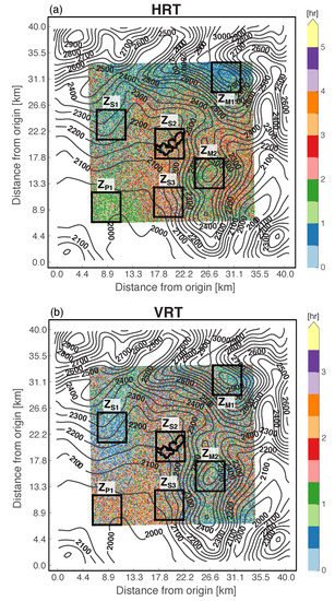Figure 7 shows the initial particle position of all particles released during the simulation, with the HRT and VRT of each particle (Figure 7a,b, respectively) indicated by marker color. The particle plots in Figure 7 depict spatially heterogeneous patterns of HRT and VRT that appear to correspond to the pattern of surface elevation (dark gray contours in Figure 7). Despite sharing the common trait of a RT–topography correspondence, the patterns of HRT and VRT are not identical. Broadly speaking, HRT is shortest in the higher terrain across the northern third of the release zone (0–1 h), and longest along the west- and east-facing slopes of the prominent ridgeline southeast of burn units 10 and 11 (2+ h) (Figure 7a). In the southwest corner and atop the ridgeline, HRT is generally between 1–2 h. Regarding VRT (Figure 7b), RT is shortest in the western portion of the release zone (0–0.5 h), and longest along an axis from the southwest corner of the release zone to north of burn units 10 and 11 (1.5–2.5 h), with VRT on the order of 0.5–1.5 h along the north-south ridgeline and in the higher terrain across the north.