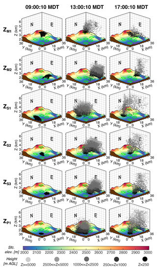 With the analysis zones defined, a comparison of PM “plumes” from each zone is presented in Figure 8. The term “plume” is used with caution here, as the “plume” for each analysis zone is visualized by isolating all particles released from that zone; recall that particles are released throughout the 28-km × 28-km release zone depicted in Figure 1c and Figure 7. Considering all times and zones, a general diurnal pattern is evident. At 09:00:10 MDT (Figure 8, left column), north to northeast winds and stable stratification (Figure 3a) yield near-surface transport of particles toward lower elevations, with direction of transport varying between analysis zones and with little to no vertical movement of particles. At 13:00:10 MDT (Figure 8, center column), southwest to west winds through a deep mixed layer (Figure 3c,d and Figure 4) yields lofting of particles and plumes directed toward the northeast and east. Finally, at 17:00:10 MDT (Figure 8, right column), the preceding hours of strong particle dispersion yield less concentrated plumes, again directed toward the northeast and east. The exception to this general behavior at 17:00:10 MDT is the behavior of particles released within Z: north winds and stable stratification within the thunderstorm outflow (Figure 6i) yields a plume directed toward the south, with relatively little vertical mixing. One hour later, the outflow has passed through the remainder of the domain (Figure 6l), impacting dispersion in all analysis zones (not shown). Finally, it is worth noting that particle dispersion differences among analysis zones are greatest at 09:00:10 MDT, smallest at 13:00:10 MDT, and larger again at 17:00:10 MDT as thunderstorm outflows impact the northernmost zone (Z) first.