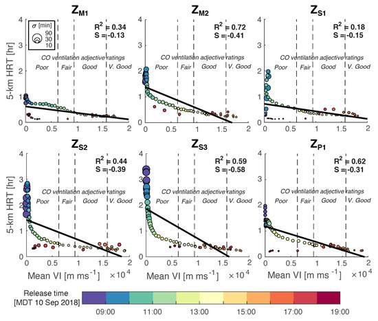 Comparing the VI–HRT scatter plots and linear regression lines in Figure 9, the analysis zones can be divided into two groups based on R: zones with R less than 0.5 (Z, Z, and Z), and zones with R greater than or equal to 0.5 (Z, Z, and Z). In the first (second) group, the linear regression explains less (more) than half of the variability in HRT. It is worth noting that the robustness of the VI–HRT relationship is independent of the general analysis zone grouping (mountain, slope, plains). It is also worth noting that the R and S values in the second group (0.59–0.72 and −0.31–−0.58, respectively) are smaller than those judged robust in [8] (0.79–0.8 and −0.63–−0.67, respectively). The smaller values of R and S noted in this study have two likely sources. First, the occurrence of a complete daytime PBL cycle during the Saul’s Creek event, with a stable PBL transitioning to a convective PBL and then back again, means that particle dispersion is simulated during both poorly-mixed and well-mixed atmospheric states (unlike the exclusively well-mixed state in [8]); note in Figure 9 that HRT sharply decreases with increasing VI in the extreme left side of the scatter plots. Second, the occurrence during the Saul’s Creek event of thunderstorm outflows yields points on the scatterplot distant from the linear regression line (see markers with colors corresponding to release times of 17:00–19:00 MDT). For these particle bins, VI is small because MH is small (due to the stably stratified air within the outflows), but horizontal dispersion is strong due to the enhanced wind speeds within the outflows. Finally, maximum HRT in the upper-left corner of each panel ranges from 3–3.5 h for Z and Z, to 2 h for Z, Z, and Z, to 1 h for Z. The sharp decrease in HRT with increasing VI is limited to VI values of approximately m ms or less; for VI greater than m ms, HRT decreases with increasing VI at about the same rate in all zones (1 h/ m ms). Put another way, HRT varies by about one hour across the range of Colorado VAR categories from “Poor” to “Very Good”. Lastly, R and S values are consistently smaller for VRT than HRT (cf. Figure S1 and Figure 9), with changes to VRT with increasing VI limited to the far left edge of the VI-VRT scatter plots. Thus, VI appears to have less diagnostic potential for vertical dispersion than for horizontal dispersion, consistent with [8].