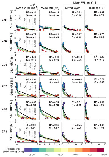 Scatter plots of ensemble mean HRT (y-axis), and (from left to right) mean VI, MH, and WS (mixed layer and 0–10 m AGL) (x-axis). Marker color corresponds to the one-hour release time block indicated in the color bar below the figure. The thick black line is the linear regression, S is the normalized slope, computed as the slope divided by the plot aspect ratio [(y y)/(x x)], and R is the coefficient of determination. State of Colorado VI adjective ratings are provided in the first column, for reference only (adjective ratings developed by state of Colorado, with little documentation of their origin).