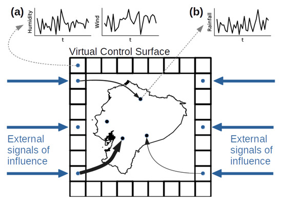 In the case of the analysis of the influence of humidity and wind outside the GRI on the rainfall inside that region, the control surface is operationally defined as a set of specific points storing time series of humidity and wind. Besides, in the GRI (the control volume), there are rainfall time series either in specific positions or symmetrically arranged positions, e.g., from satellite observations or climate models. Inference from external influence can be carried out using a causal inference method such as Granger causality, which has been used to infer matter and energy flows in the climate system [11,12], or any others such as those based on the theory of information [39].