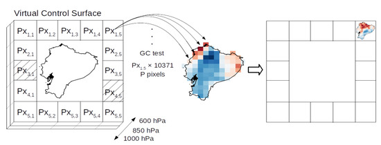 A squared boundary (the virtual control surface) around the limits of the study area (the virtual control volume) was set; this corresponds to the external pixels shown in Figure 2a. As shown in Figure 4, such square boundary limits are 7.5° S–2.5° N and 82.5° W–72.5° W, with spatial resolution 2.5°, which is determined by 16 pixels around Ecuador. Each of these pixels has been called Pxi,j, where i (j) corresponds to the row (column) of the square boundary. The inference of causal connections is carried out at the three pressure levels 1000, 850, and 600 hPa, from each pixel of the boundary (with data of and at each pixel) towards the rainfall in Ecuador (10,371 rainfall pixels).
