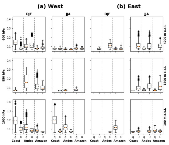 The influence of and on presented substantial variability throughout the year and at different altitudes, with a clear distinction regarding the influence direction (from east or west). This confirms that the Andes act as a blocking element [48], which defines rainfall patterns in the three regions. Figure 5a shows the causal connection strength ( and toward ) from the west (striped Px3,1 pixel in Figure 4), near to the Guayaquil gulf. The GC strength is spread out in DJF and JJA (showed as columns) at different pressure levels (i.e., altitudes, shown as rows) for the three regions (coast–Andes–Amazon) separated by the dashed vertical lines. Similarly, Figure 5b shows the GC strength from the east (striped Px4,5 pixel in Figure 4). Each boxplot shows the distribution of the GC strength between and (shown in the figure within each region) in pixels Px3,1 (Figure 5a) and Px4,5 (Figure 5b) toward pixels in the three regions. The direction of the connections (beside the clear dependence of the altitude and season) allows for the division of the discussion horizontally, i.e., western and eastern influence; vertically, i.e., the lower troposphere, from 1000 to 850 hPa (approx. 100–1500 m a.s.l.) and the middle troposphere at 600 hPa (approx. 4200 m a.s.l.); and finally, in the austral summer (DJF) and winter (JJA).