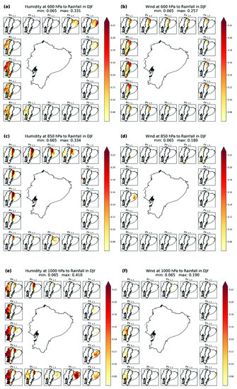 In general, it is possible to notice differences in the GC strength between DJF and JJA, and between the connections from the east and the west toward the three climatic regions. It is important to note that from the west, humidity plays the leading role in the Ecuadorian rainfall anomalies (mainly in the coast), which change when analyzing the signals from the east, from where the wind is more important. This may be related to the bimodality of rainfall in the inter-Andean mountain range influenced by the Pacific during January–May [53] and by the Amazon air in October and November [54]. The results above evidence that the method proposed here is capable of identifying the seasonal patterns of the regions adequately. Furthermore, patterns in GC strength at the middle troposphere allow for the division of the analysis into two levels of altitude: lower troposphere (1000–850 hPa, approx. 100–1500 m a.s.l.) and middle troposphere (600 hPa, approx. 4200 m a.s.l.). Likewise, the analysis of the connections spatial patterns from this point onward is divided between the causal signals from the west and east.