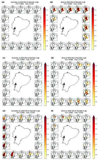 Figure 6 shows that the most important feature in DJF is the causal connection of toward in the Amazon region from the east but with a differentiated influence according to the altitude. While in the lower troposphere, the connections toward in the Amazon comes from the southeast (Figure 6e), at higher altitudes (600 hPa), the influence comes from the northeast (Figure 6a). Regarding this feature in DJF, Drumond et al. [8] showed the influence of the tropical Atlantic towards the Amazon river basin (the Ecuadorian Amazon is located within it), and a division between the influence of the northern and southern tropical Atlantic is evident [1]. According to our new findings, such influence may have its pathways at different altitudes. Thus, the Ecuadorian Amazon receives the influence as high as approximately 850 hPa (approx. 1500 m a.s.l.) from the southern tropical Atlantic and the influence at altitudes higher than 850 hPa from the northern tropical Atlantic (Figure 8a). This is consistent with the known influence of the South American low-level jet that is the primary conveyor of humidity and factors for producing rainfall in South America. Meanwhile, higher winds act from the northern tropical Atlantic.