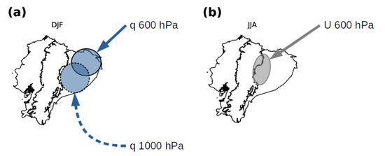 Scheme of connections between q and U, from the eastern pixels, toward P in (a) DJF and (b) JJA.