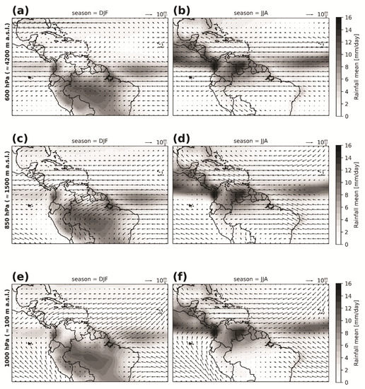 Mean of daily rainfall during DJF (left column) and JJA (right column) shown as colored backgrounds and the mean wind field at 600 hPa (a,b), 850 hPa (c,d), and 1000 hPa (e,f) (approx. 4200, 1500, and 100 m a.s.l., respectively). The precipitation data are from the Global Precipitation Climatology Project [64].