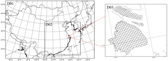 The modeling domains of WRF-CMAQ (Weather Research and Forecasting-Community Multiscale Air Quality). The outermost domain covers all of East Asia, the intermediate domain covers the eastern part of China, and the innermost domain covers the whole of Shanghai. (The urban areas of Shanghai are marked with grid).