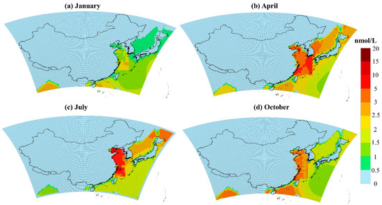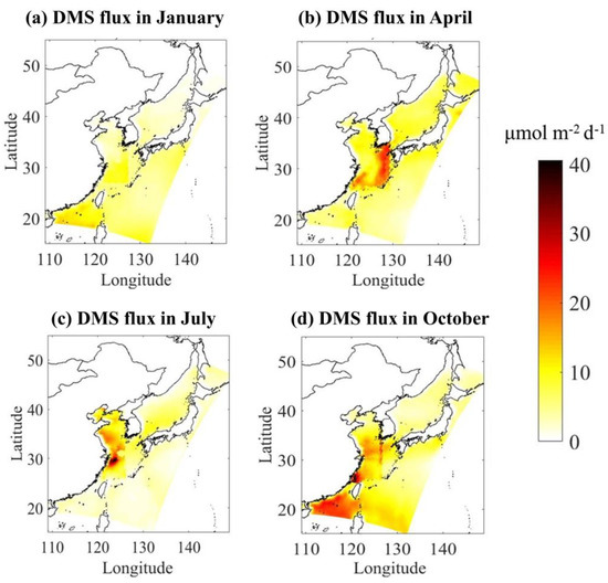 Demonstrated in Figure 3 are the spatial distribution of DMS emission fluxes in four typical months of January, April, July, and October, representing winter, spring, summer, and autumn, respectively. The emission flux of DMS varies considerably in different seasons. The highest flux appears in summer in the East China Sea ranging between 0.02~40.57 μmol m−2 d−1 and the average flux is 7.42 μmol m−2 d−1. Autumn has the second highest flux with a maximum of 31.70 μmol m−2 d−1 and a mean of 4.23 μmol m−2 d−1. Spring has the third highest flux with a maximum and mean value of 18.22 μmol m−2 d−1 and 3.70 μmol m−2 d−1, respectively. The emission flux of DMS is the lowest in winter in the range of 0.52–14.92 μmol m−2 d−1 with an average of 2.13 μmol m−2 d−1. Several factors affect DMS emissions; however, the seasonal variations in DMS concentrations in seawater are largely responsible for the variations in the DMS emission flux. For example, the average DMS concentration in seawater in summer is 1.3 times that of autumn, while the average flux of DMS is 1.6 times that of autumn. In addition, the concentration of DMS in seawater in spring is higher than that in autumn, but the sea-to-air emission flux of DMS in spring is lower than that in autumn, which is caused by the higher wind speed in autumn. The total simulated sea area including the Japan Sea is 6.487 million km2. DMS emissions in spring, summer, autumn and winter are 0.13, 0.27, 0.16, and 0.08 Tg S on the basis of the monthly average flux, and thus the estimates of the annual release of DMS is 0.64 Tg S a−1.
