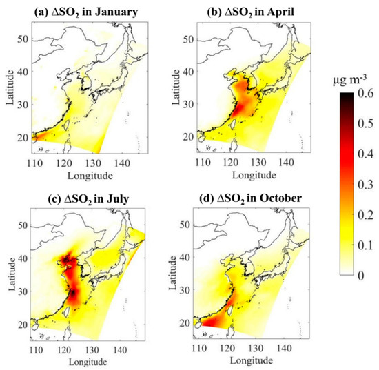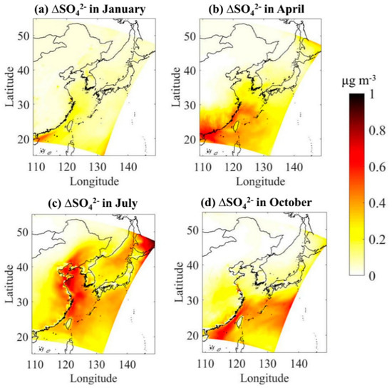 Figure 5 shows the absolute contribution of DMS to atmospheric concentration in four typical months. The addition of DMS emissions also increases the atmospheric concentration of over the ocean area by 0.10–0.96 μg/m3. DMS has the highest contribution to the regional atmospheric levels in summer and the highest value occurs in the area from the south of Shandong Peninsula to the northern Jiangsu coast. The contribution to levels is the lowest in winter. The average contribution of DMS in spring, summer, autumn and winter to the atmospheric concentration over the three China Seas (Yellow Sea, Bohai Sea, and East China Sea) is 0.68, 0.52, 0.32, and 0.20 μg/m3, respectively. Unlike SO2, the enhancements in concentration are not limited to the areas with large DMS emission fluxes in the coastal waters of China. It also has a relatively large increase on the land in eastern China and in the open sea. This is mainly due to the shorter residence time of SO2 in the atmosphere, while is mainly distributed in fine-particles and has a longer residence time [60], so it can be transported a longer distance.