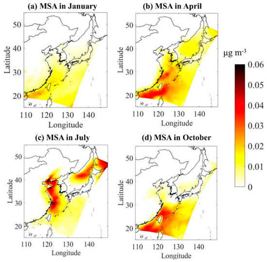The spatial distribution of atmospheric gas-phase MSA in four typical months of (a) January, (b) April, (c) July, and (d) October.