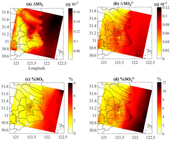 The absolute contribution of DMS to the annual average concentration of (a) SO2 and (b) and the relative contribution of DMS to the annual average concentration of (c) SO2 and (d) in Shanghai.