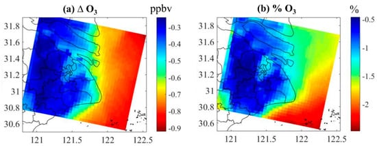 The absolute and relative contribution of DMS to the annual average concentration of O3 in Shanghai is shown in Figure 8. The addition of DMS to the model reduces surface O3 concentration. This effect is relatively higher in the sea area with a reduction of about 0.65~0.90 ppbv (about 1.5–2.5%). The impact of DMS emissions on the urban land area of Shanghai is relatively small, where the O3 concentration is reduced by 0.5 ppbv (about 1.25%) at the coastal line and 0.25~0.40 ppbv (about 0.5 to 1%) in most urban areas. The reactions of DMS with iodine monoxide (IO) and bromine monoxide (BrO) release iodine (I) and bromine (Br) atoms which react with O3 to reduce its concentration. In addition to the contribution to aerosols, marine biogenic DMS emissions also influence O3 which can be an area of further research.