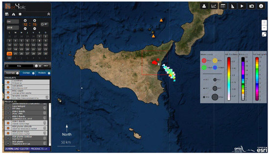 Screenshot of the HOTVOLC interface centred on Mount Etna (Sicily) during the 24 December 2018 eruption and showing the ash cloud from various products (ASH-5, altitude, vertical column densities (VCD)) as well as the location of seismic events (red circles).