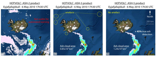 In Figure 2 we provide one example showing differences between the three different algorithms used during the 6 May 2010 Eyjafjallajökull eruption. The 2-band method shows a good sensitivity to ash detection but produces a very large number of false alarms. Those biases can sometimes be overcome from the supervision of a user, but prevent any automated warnings. The 3-band method succeeds in removing most of artefacts, but one can observe that the ash detection sensibility has decreased significantly on the edge of the cloud. Finally, we show that the 5-band method (ASH-5 product) allows removing all artefacts, while increasing the detection sensibility at the same time. Indeed, it improves the detection of ash-bearing pixels by 45% (in terms of cloud area). This good result is due to an original multispectral combination associated with clustering routines. However, those methods remain complementary in some cases and we decided to keep all three in the operational system HOTVOLC.